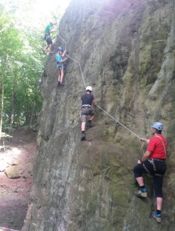 Přítomní vyslechli instruktáž horolezeckých instruktorů, jak a především s čím se pohybovat na této zajištěné cestě, a pak to již mohlo začít: První, kdo novou ferratu na Slánské hoře vyzkoušeli byli mladí členové slánského horolezeckého oddílu Pohodička.